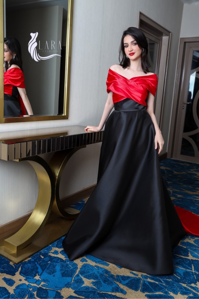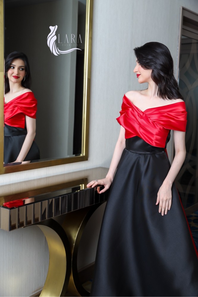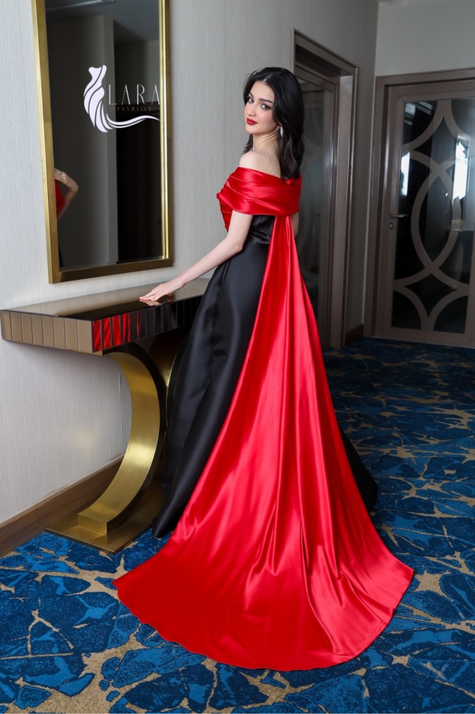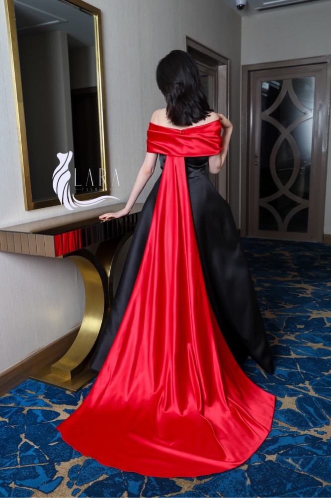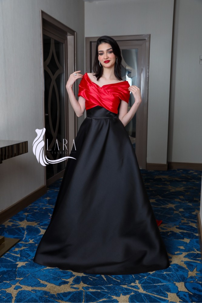 فستان صدرية وذيل أحمر هي إطلالة أنيقة وجذابة تلفت الأنظار.