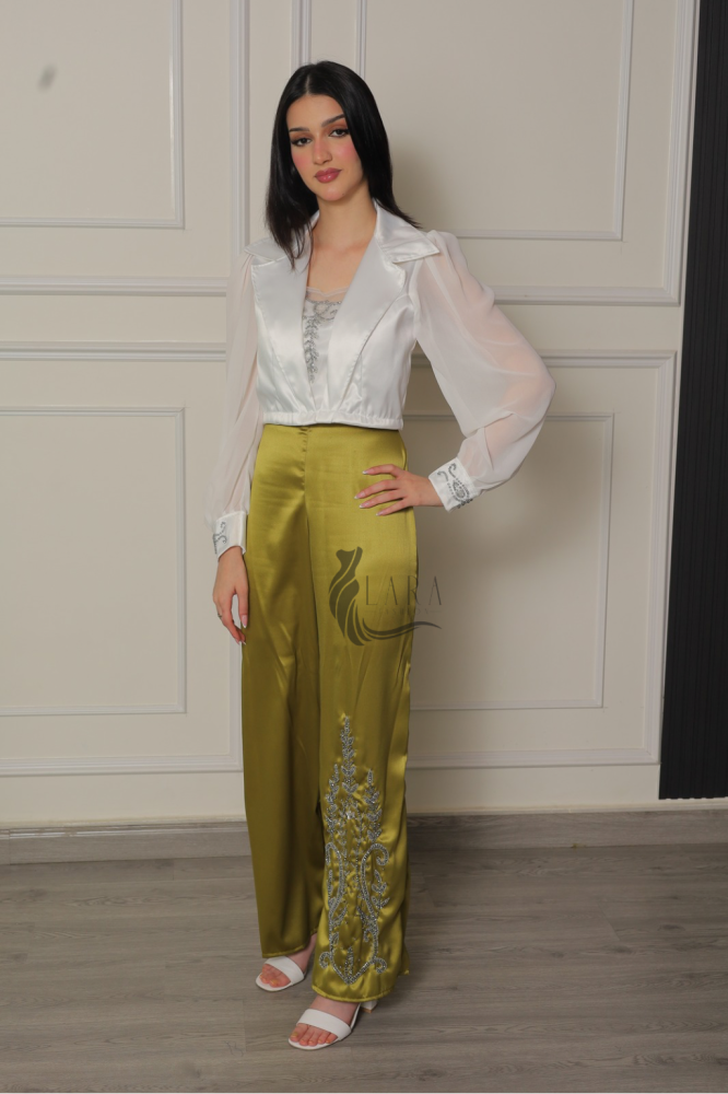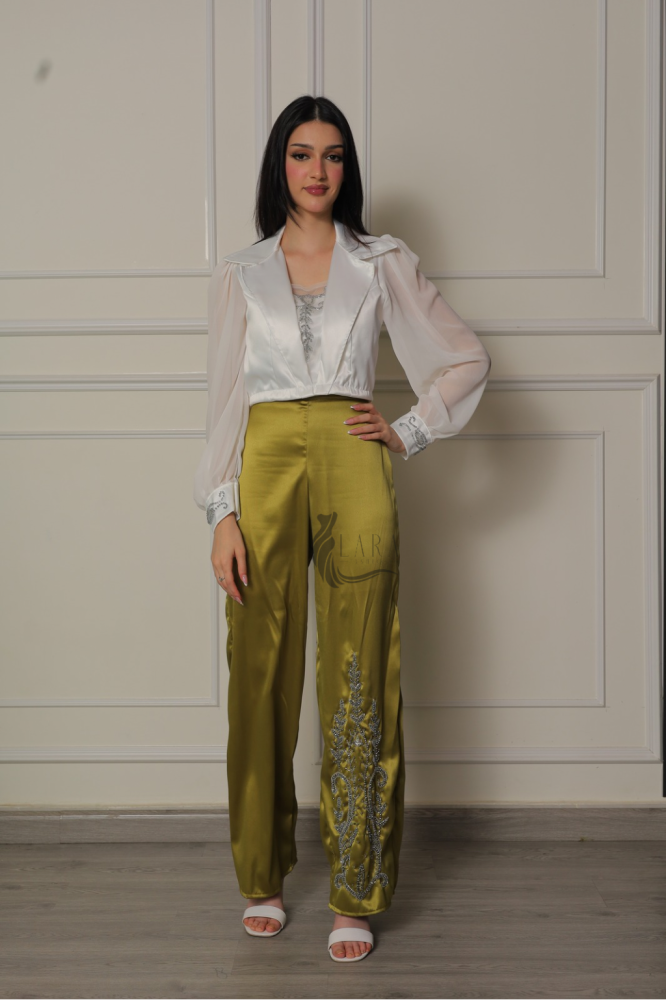تألقي بإطلالة ملفتة للإنظار مع جمبسوت مطرز بعناية , يتميز بتصميم مفعم بالأنوثة بـ صدريه مطرزه v , واكمام واسعه تل